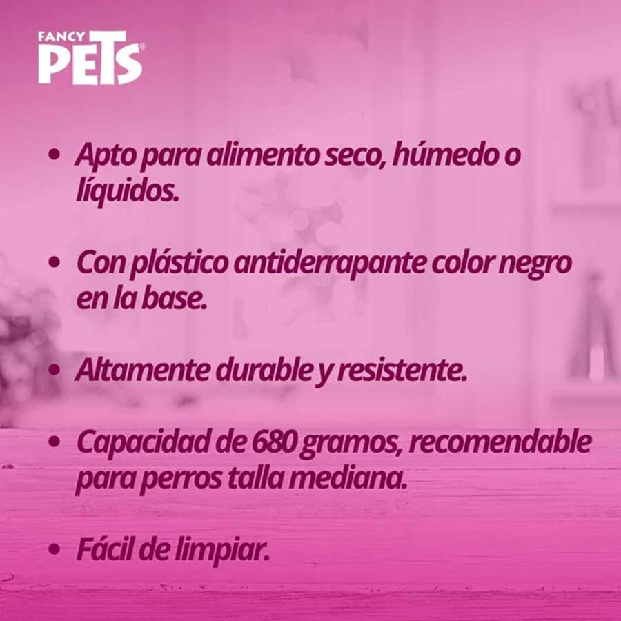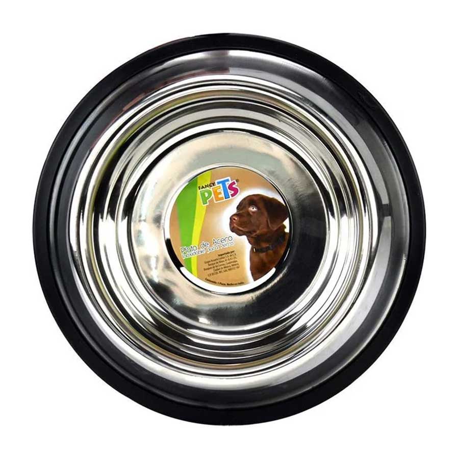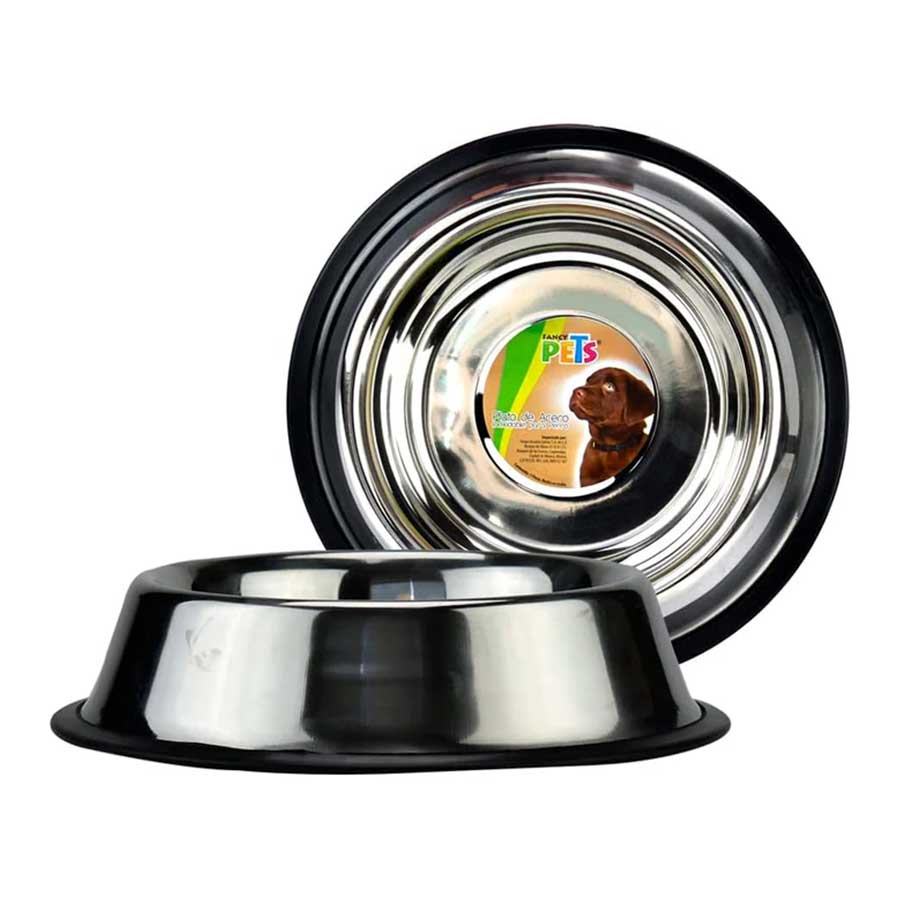 Plato de la marca Fancy Pets Fabricado en acero inoxidable de alta calidad, resistente, duradero y libre de acumulación de suciedad. Apto para alimento o agua, con contorno inferior de goma que evita deslizamientos mientras tu mascota come o bebe.